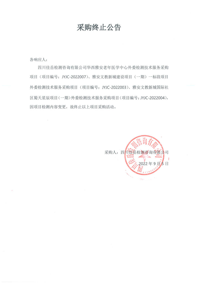 四川佳岳檢測(cè)咨詢有限公司采購項(xiàng)目(項(xiàng)目編號(hào):JYJC-2022007、JYJC-2022003、JYJC-2022004)采購中止公告