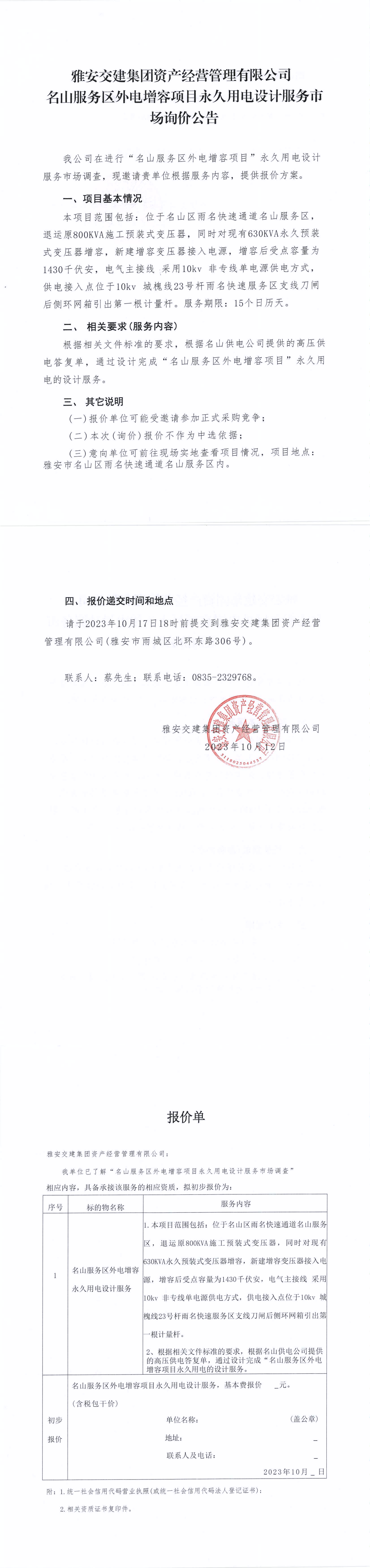 雅安交建集團(tuán)資產(chǎn)經(jīng)營管理有限公司名山服務(wù)區(qū)外電增容項目永久用電設(shè)計服務(wù)市場詢價公告