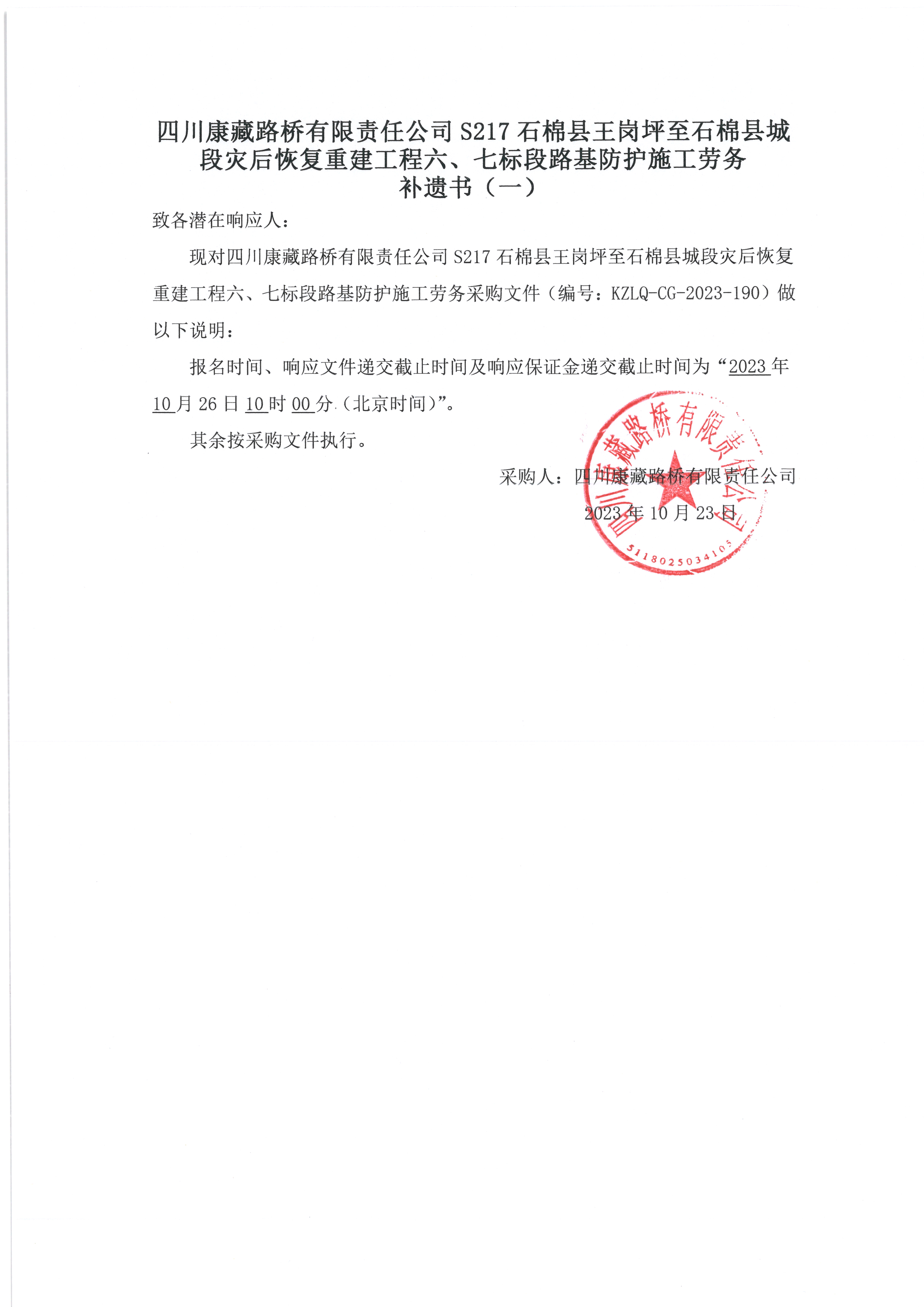 四川康藏路橋有限責任公司S217石棉縣王崗坪至石棉縣城段災(zāi)后恢復重建工程六、七標段路基防護施工勞務(wù) 補遺書(一)
