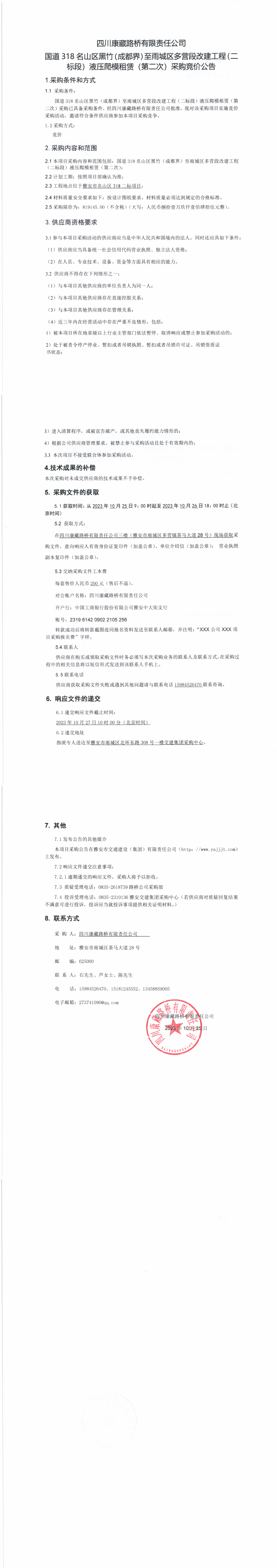 四川康藏路橋有限責(zé)任公司國道318名山區(qū)黑竹(成都界)至雨城區(qū)多營段改建工程二標(biāo)段液壓爬模租賃(第二次)采購競價(jià)公告