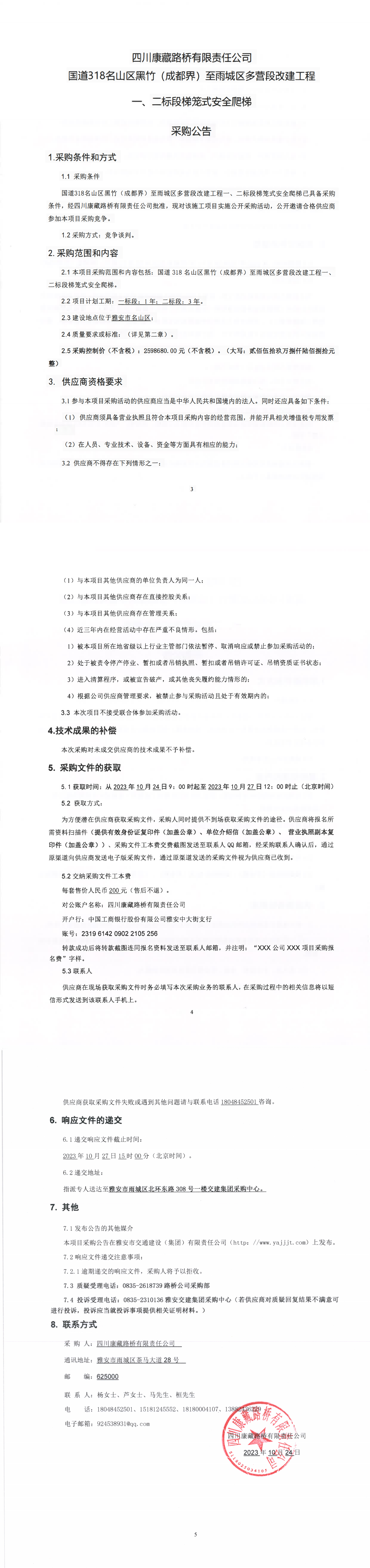 四川康藏路橋有限責(zé)任公司國道318名山區(qū)黑竹(成都界)至雨城區(qū)多營段改建工程一、二標(biāo)段梯籠式安全爬梯采購公告