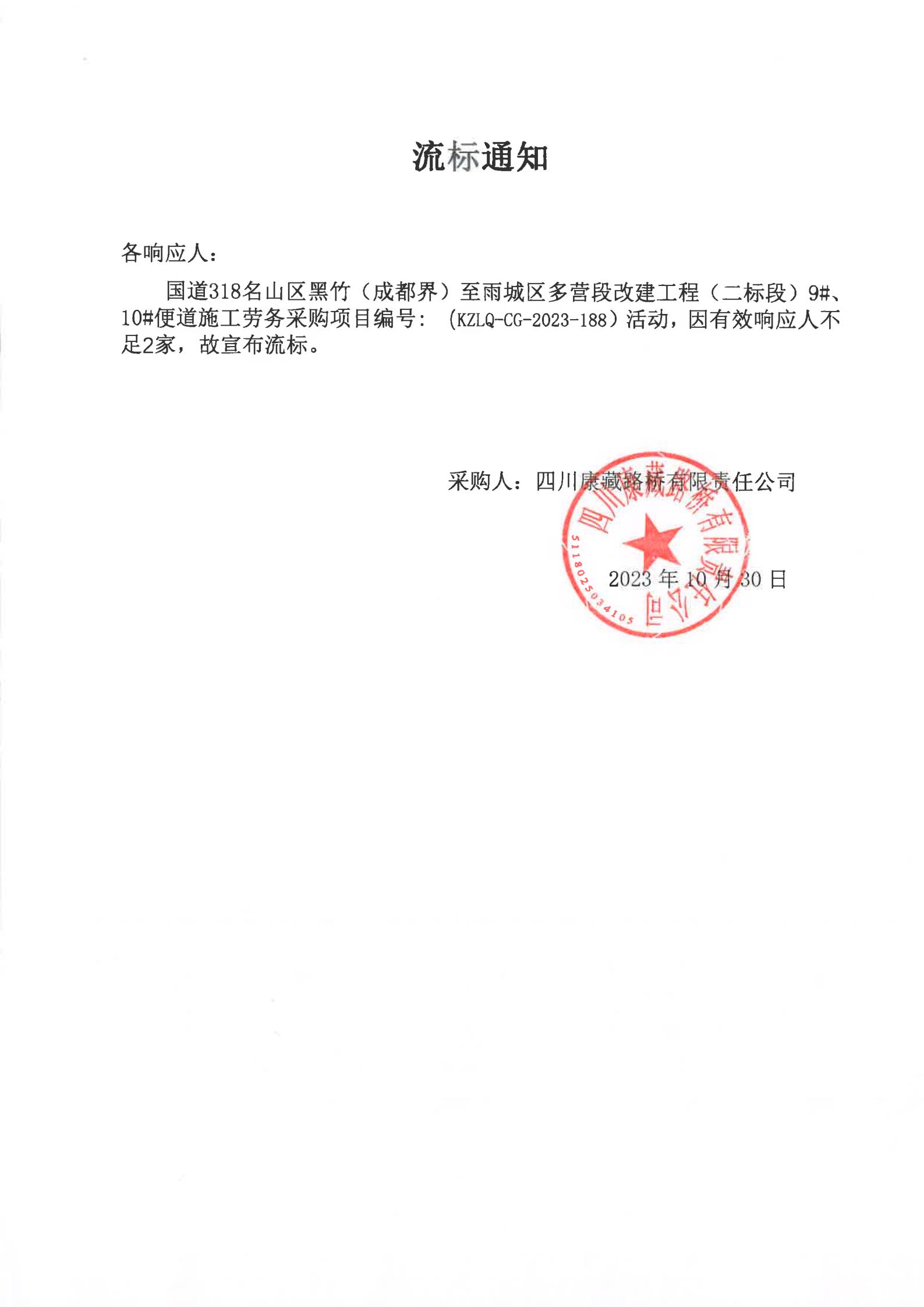 四川康藏路橋有限責(zé)任公司國(guó)道318名山區(qū)黑竹(成都界)至雨城區(qū)多營(yíng)段改建工程(二標(biāo)段)9#、10#便道施工勞務(wù)采購(gòu)流標(biāo)通知