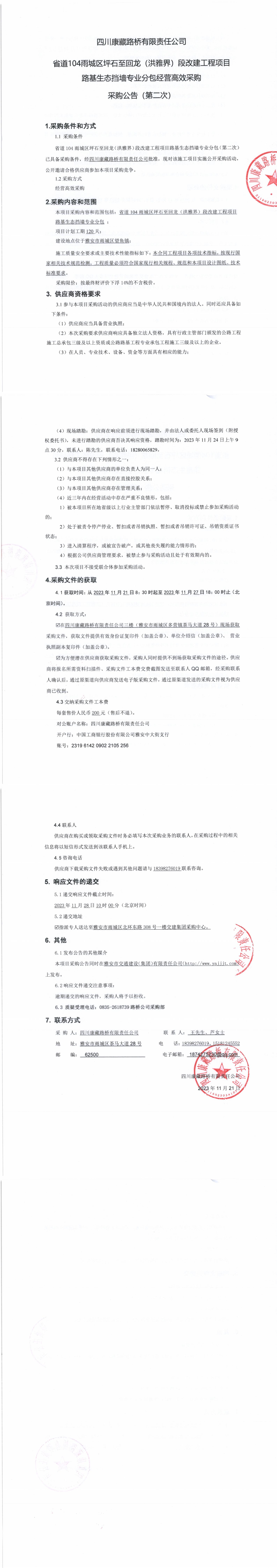 四川康藏路橋有限責(zé)任公司省道104雨城區(qū)坪石至回龍(洪雅界)段改建工程項(xiàng)目路基生態(tài)擋墻專(zhuān)業(yè)分包經(jīng)營(yíng)高效采購(gòu)(第二次)采購(gòu)公告