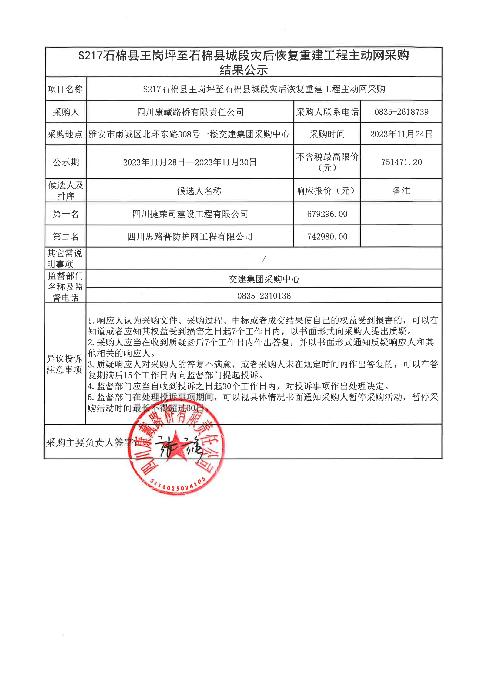 四川康藏路橋有限責(zé)任公司S217石棉縣王崗坪至石棉縣城段災(zāi)后恢復(fù)重建工程主動(dòng)網(wǎng)采購(gòu)結(jié)果公示