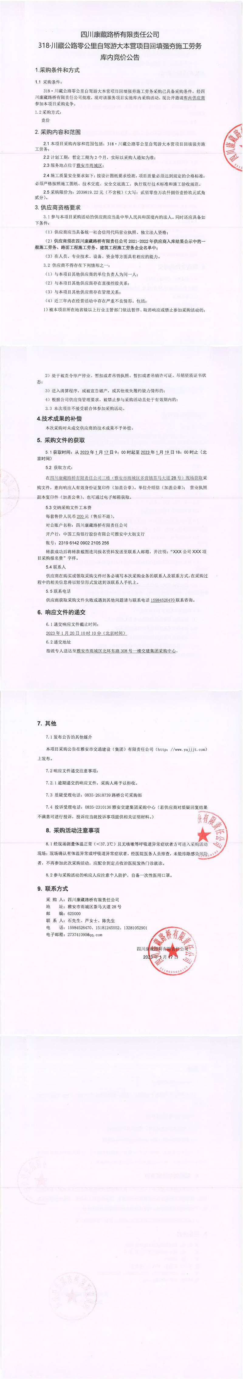 四川康藏路橋有限責任公司318.川藏公路零公里自駕游大本營項目回填強夯施工勞務庫內競價公告