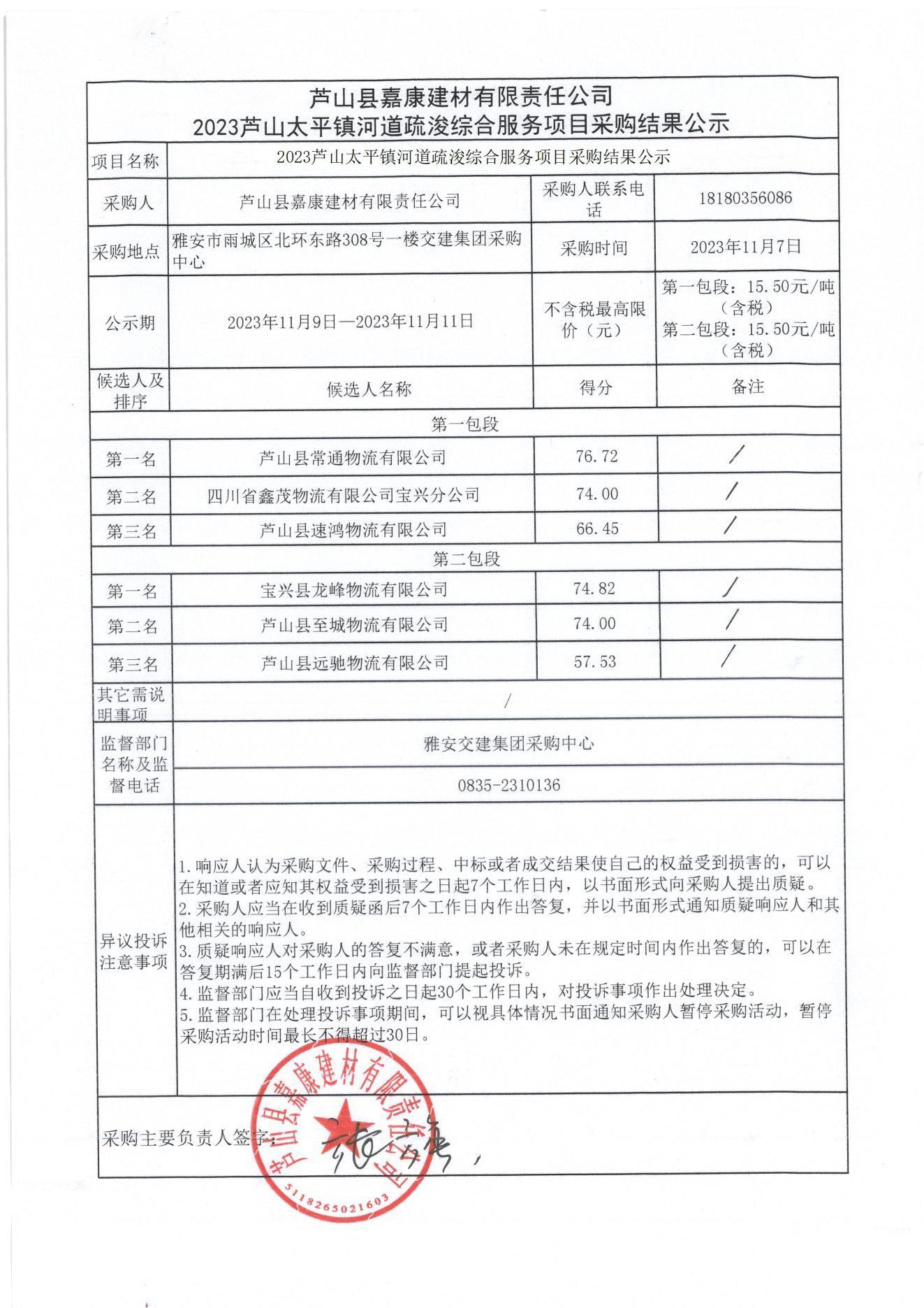 蘆山縣嘉康建材有限責(zé)任公司2023蘆山太平鎮(zhèn)河道疏浚綜合項目采購結(jié)果公示