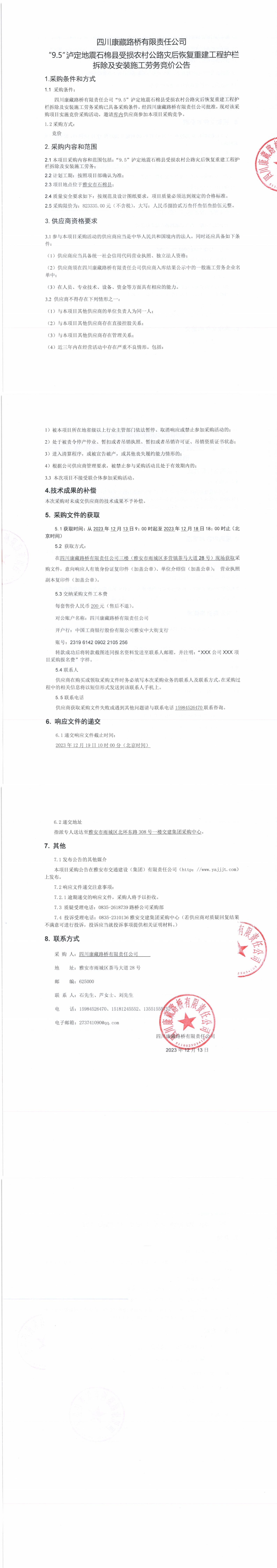 四川康藏路橋有限責(zé)任公司“9.5”瀘定地震石棉縣受損農(nóng)村公路災(zāi)后恢復(fù)重建工程護(hù)欄拆除及安裝施工勞務(wù)競(jìng)價(jià)公告