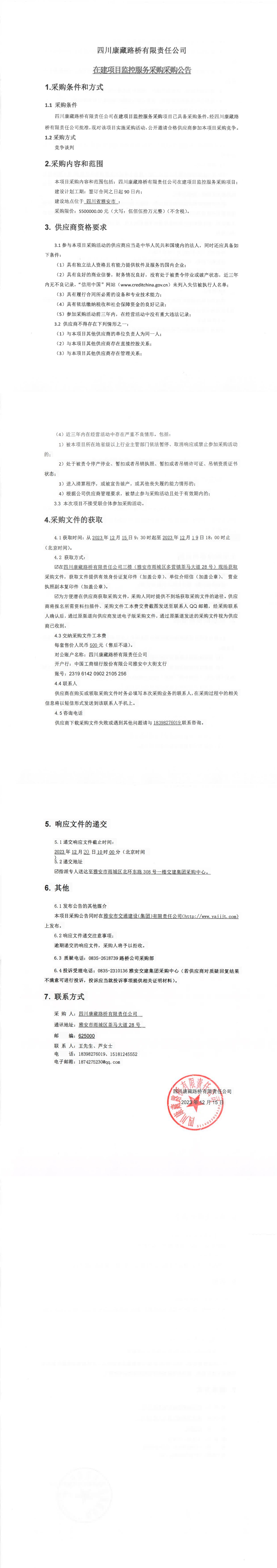 四川康藏路橋有限責(zé)任公司在建項(xiàng)目監(jiān)控服務(wù)采購公告