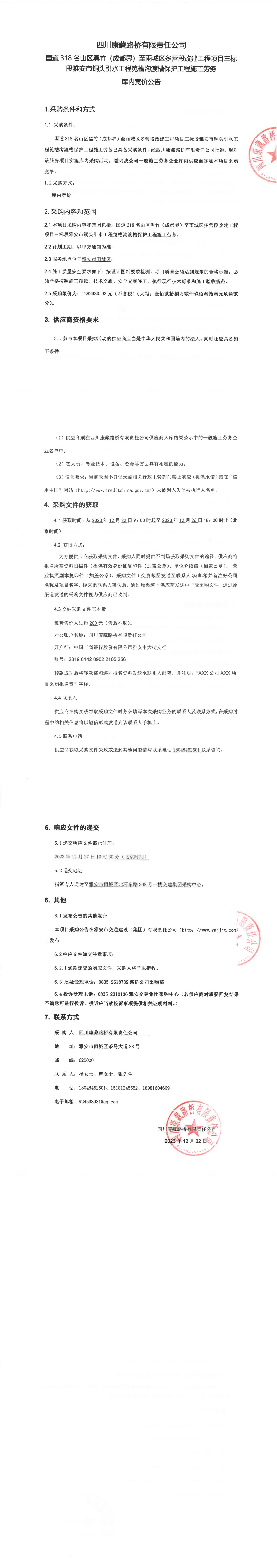 四川康藏路橋有限責(zé)任公司國道318名山區(qū)黑竹(成都界)至雨城區(qū)多營段改建工程項(xiàng)目三標(biāo)段雅安市銅頭引水工程筧槽溝渡槽保護(hù)工程施工勞務(wù)庫內(nèi)競價(jià)公告