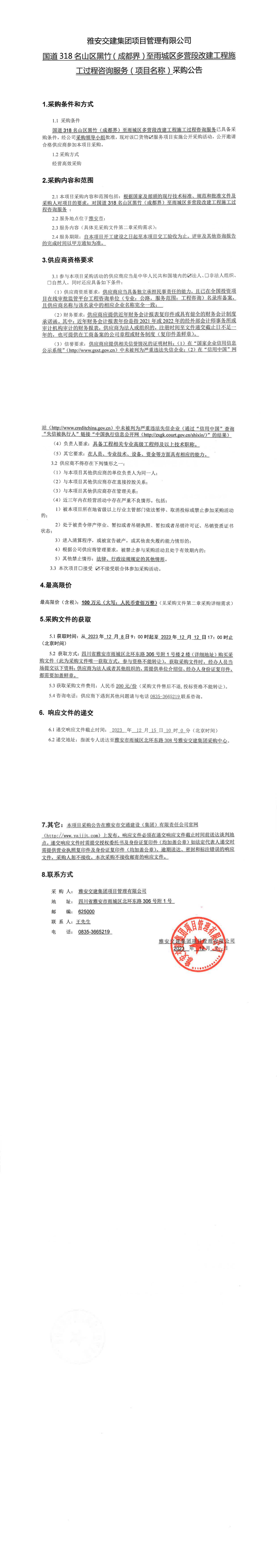 雅安交建集團(tuán)項(xiàng)目管理有限公司國(guó)道318名山區(qū)黑竹(成都界)至雨城區(qū)多營(yíng)段改建工程施工過(guò)程咨詢(xún)服務(wù)(項(xiàng)目名稱(chēng))采購(gòu)公告