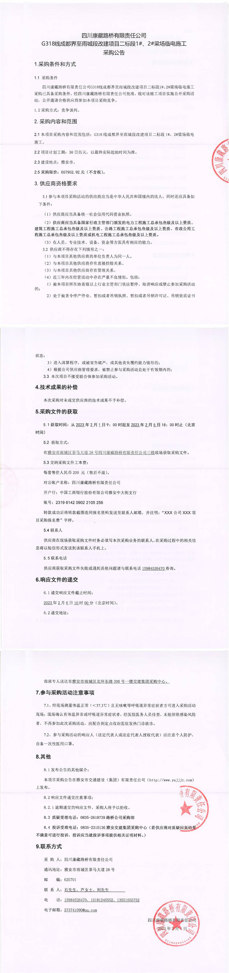 四川康藏路橋有限責(zé)任公司G318線成都界至雨城段改建項(xiàng)目二標(biāo)段1#、2#梁場臨電施工采購公告