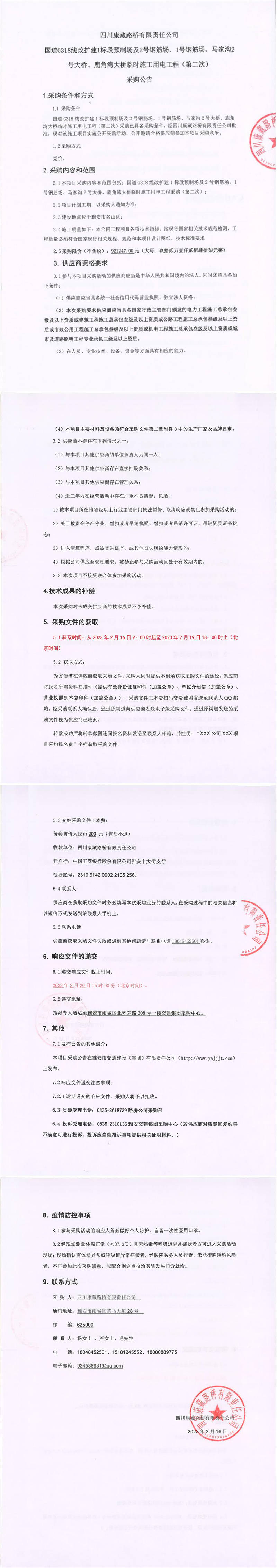 四川康藏路橋有限責(zé)任公司國道G318線改擴建1標(biāo)段預(yù)制場及2號鋼筋場、1號鋼筋場、馬家溝2號大橋、鹿角灣大橋臨時施工用電工程(第二次)采購公告