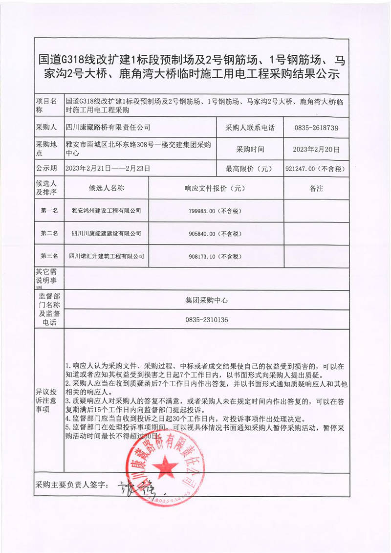 四川康藏路橋有限責(zé)任公司國道318線改擴(kuò)建1標(biāo)段預(yù)制場及2號鋼筋場、1號鋼筋場、馬家溝2號大橋、鹿角灣大橋臨時施工用電工程采購結(jié)果公示