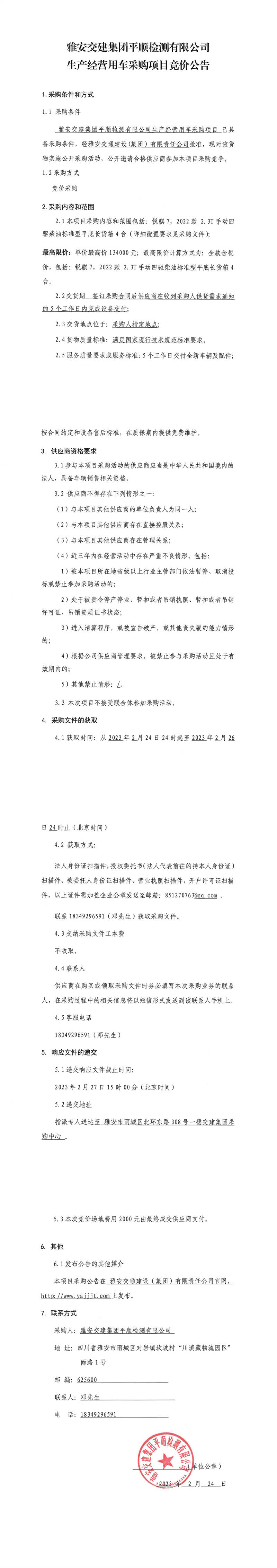 雅安交建集團(tuán)平順檢測(cè)有限公司生產(chǎn)經(jīng)營(yíng)用車采購項(xiàng)目競(jìng)價(jià)公告