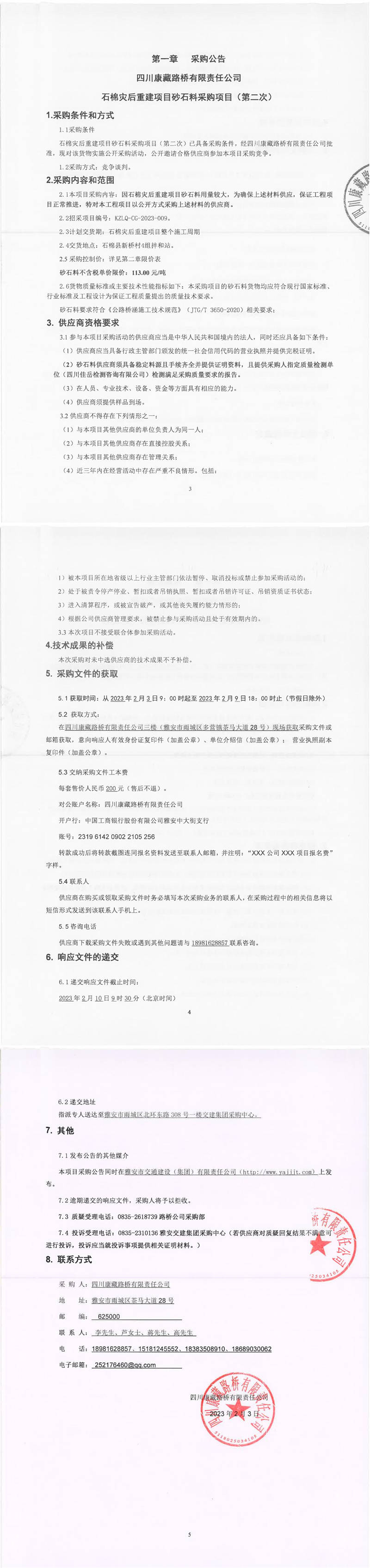 四川康藏路橋有限責(zé)任公司石棉災(zāi)后重建項目砂石料采購項目(第二次)采購公告