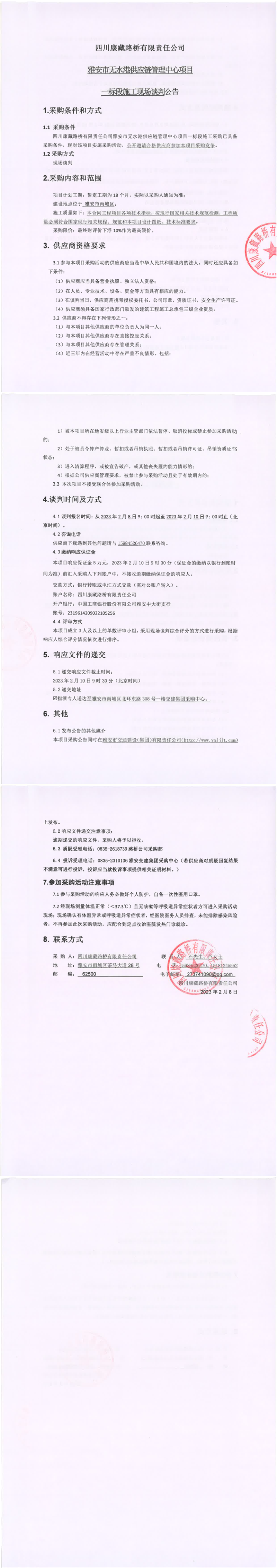 四川康藏路橋有限責任公司雅安市無水港供應(yīng)鏈管理中心項目一標段施工現(xiàn)場談判公告