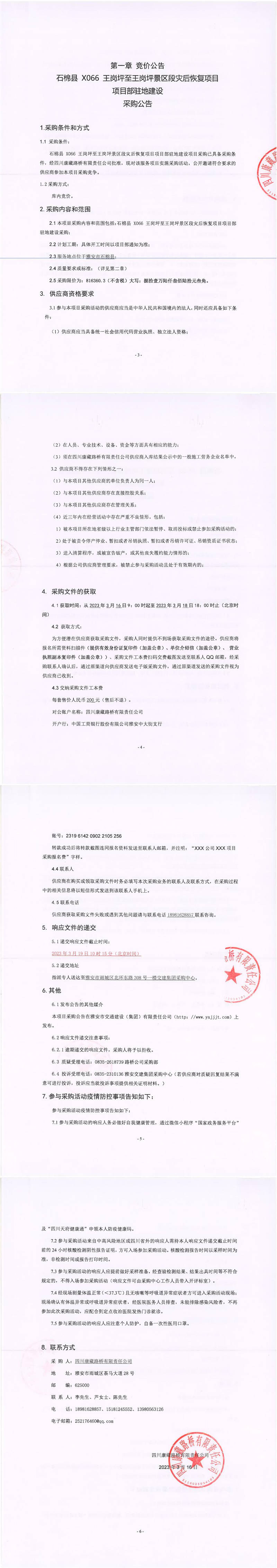 四川康藏路橋有限責(zé)任公司石棉縣X066王崗坪至王崗坪景區(qū)災(zāi)后恢復(fù)項目項目部駐地建設(shè)采購公告
