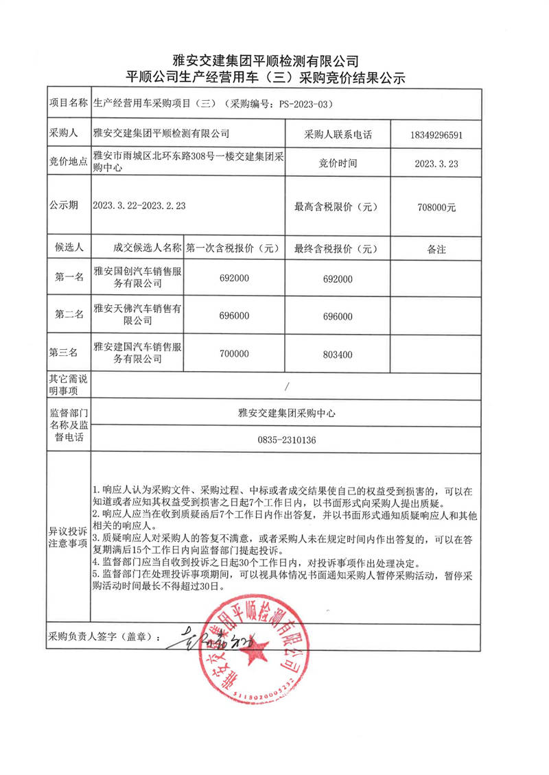 雅安交建集團(tuán)平順檢測(cè)有限公司平順公司生產(chǎn)經(jīng)營(yíng)用車(三)采購(gòu)競(jìng)價(jià)結(jié)果公示