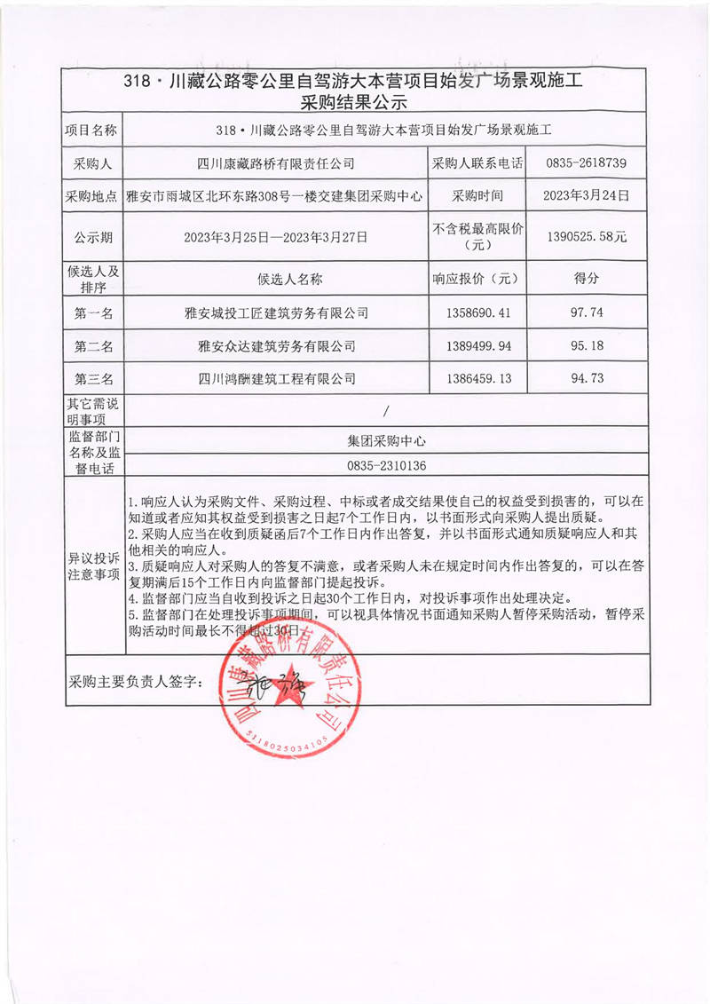 四川康藏路橋有限責任公司318·川藏公路零公里自駕游大本營項目始發(fā)廣場景觀施工采購結果公示