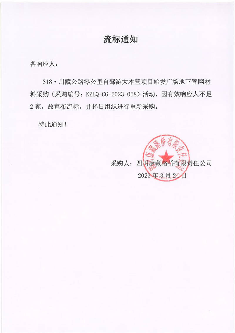 四川康藏路橋有限責(zé)任公司318·川藏公路零公里自駕游大本營項(xiàng)目始發(fā)廣場地下管網(wǎng)材料采購流標(biāo)通知