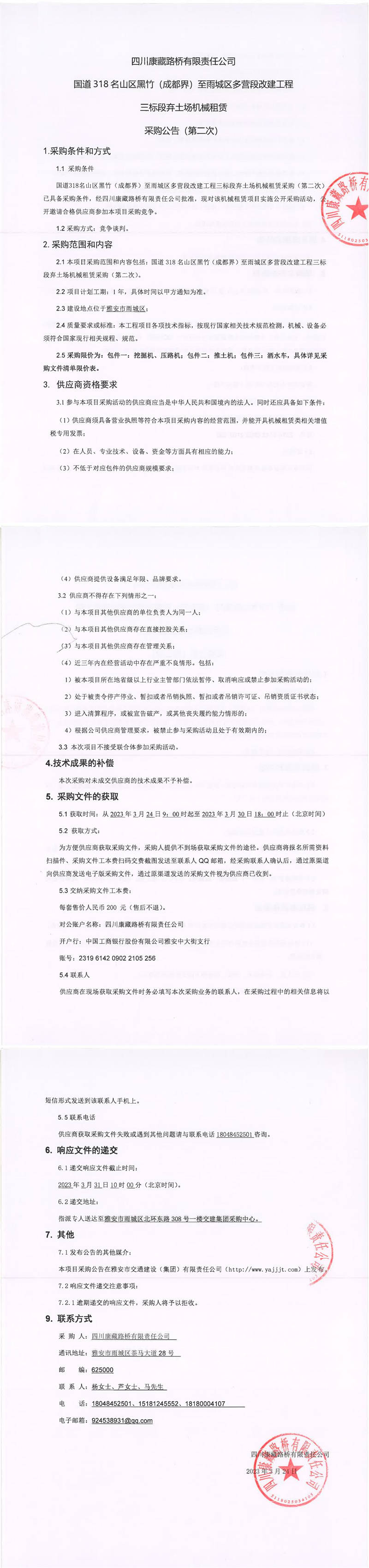四川康藏路橋有限責(zé)任公司國道318名山區(qū)黑竹(成都界)至雨城區(qū)多營段改建工程三標段棄土場機械租賃采購公告(第二次)