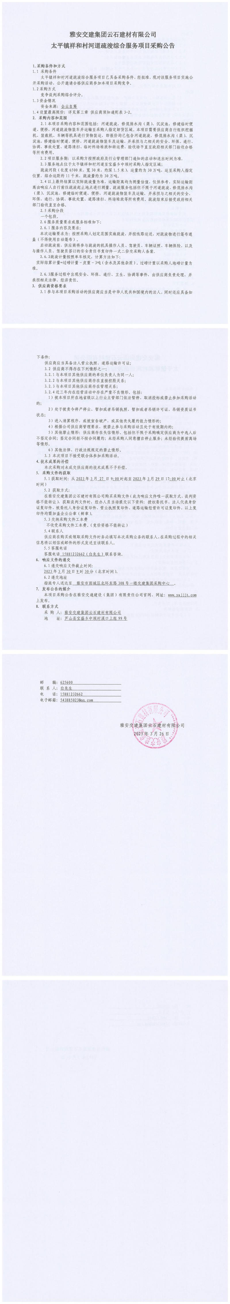 雅安交建集團(tuán)云石建材有限公司太平鎮(zhèn)祥和村河道疏浚綜合服務(wù)項(xiàng)目采購(gòu)公告