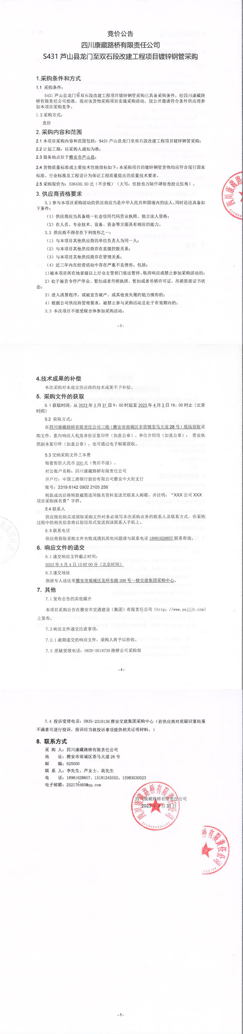四川康藏路橋有限責(zé)任公司S431蘆山縣龍門至雙石段改建工程項(xiàng)目鍍鋅鋼管采購競(jìng)價(jià)公告