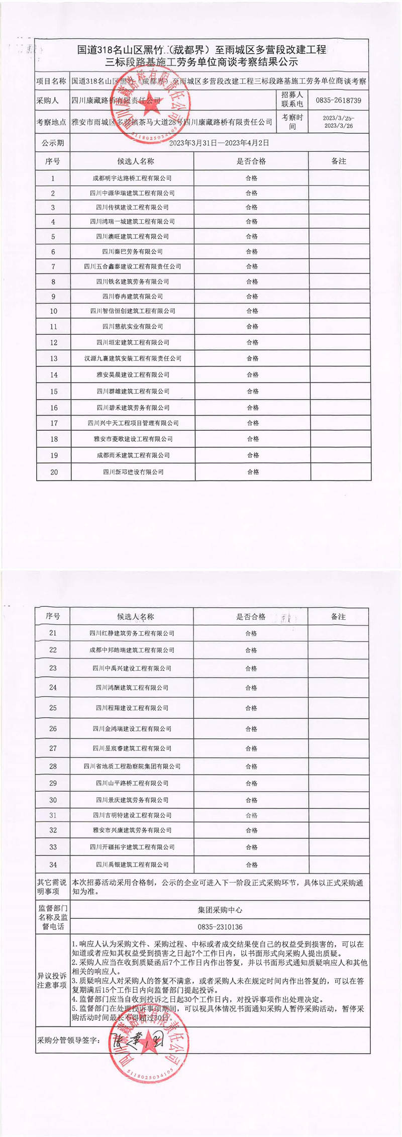 四川康藏路橋有限責任公司國道318名山區(qū)黑竹(成都界)至雨城區(qū)多營段改建工程三標段橋梁施工勞務單位商談考察結(jié)果公示