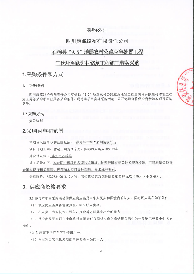 四川康藏路橋有限責任公司石棉縣“9.5”地震農(nóng)村公路應急處置工程王崗坪鄉(xiāng)躍進村修復工程施工勞務(wù)采購公告