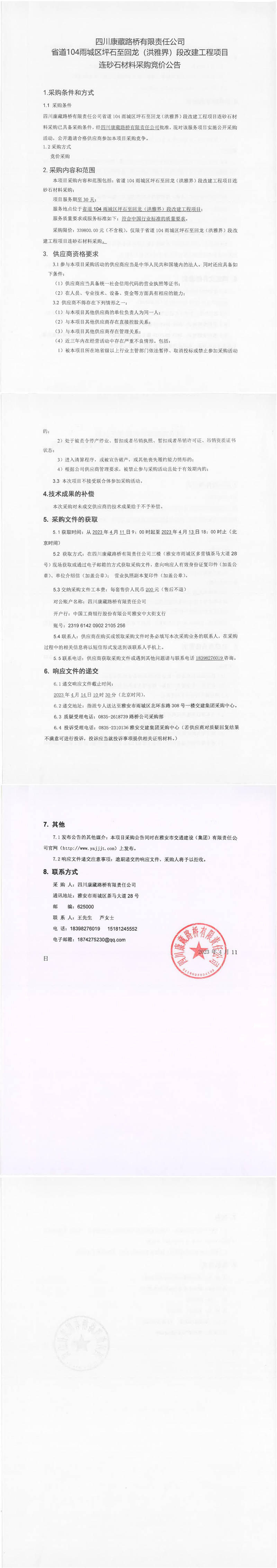 四川康藏路橋有限責(zé)任公司省道104雨城區(qū)坪石至回龍(洪雅界)段改建工程項(xiàng)目連砂石材料采購競價公告