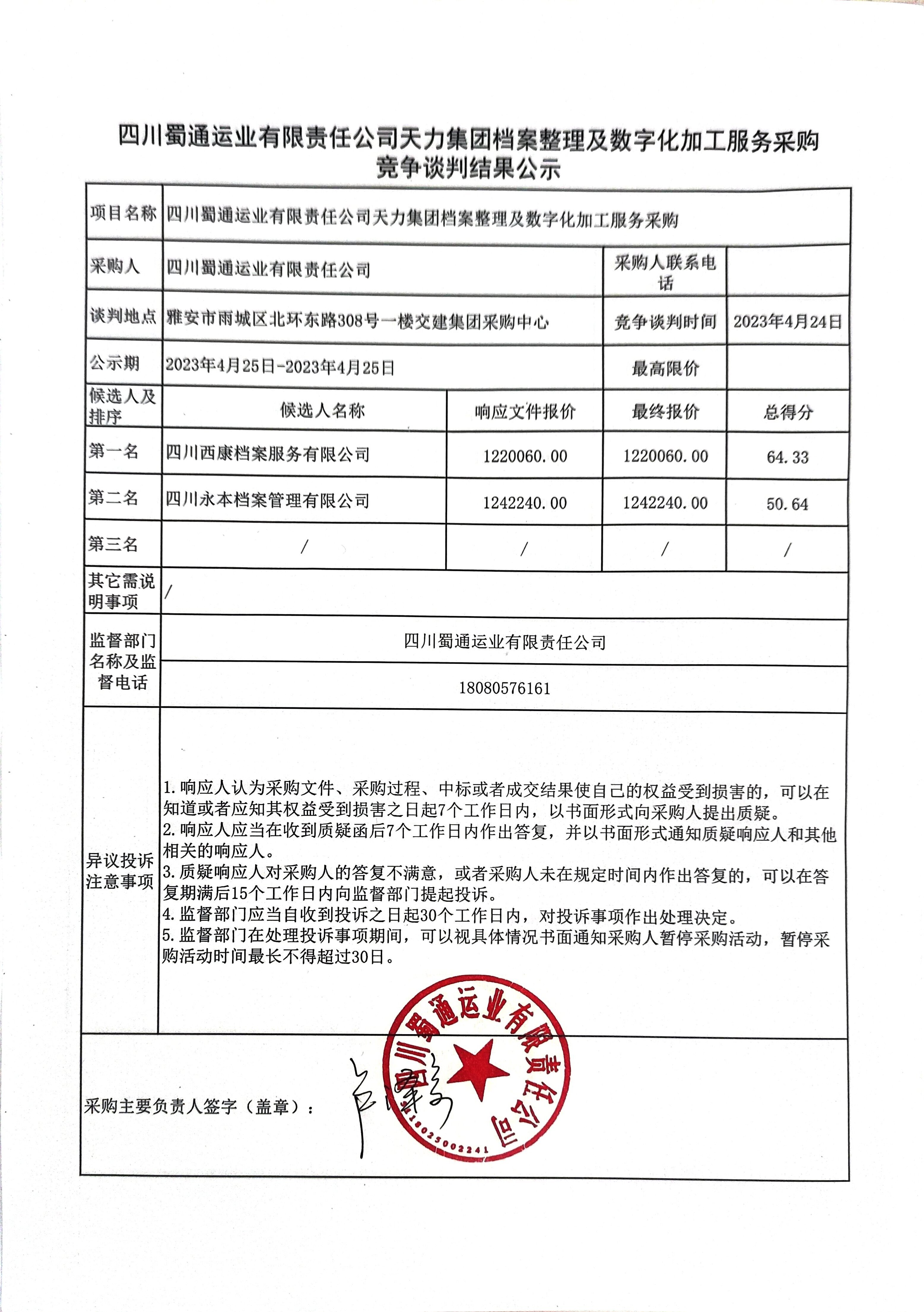 四川蜀通運業(yè)有限責(zé)任公司天力集團檔案整理及數(shù)字化加工服務(wù)采購競爭談判結(jié)果公示