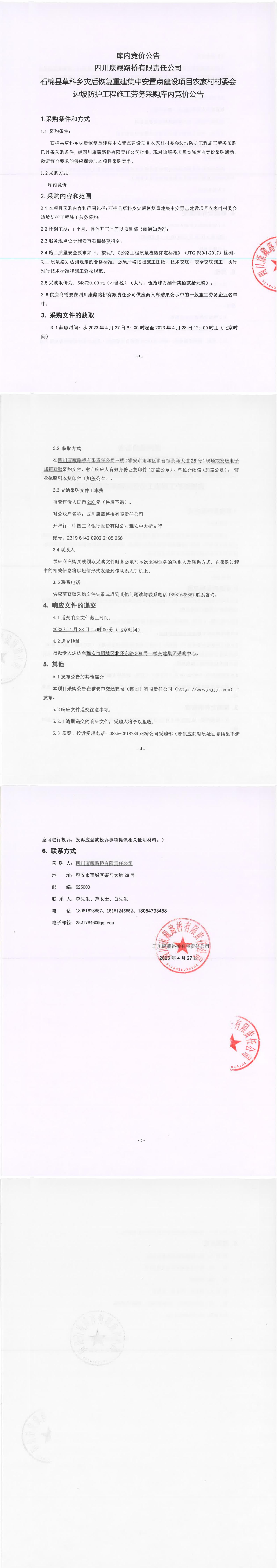 四川康藏路橋有限責任公司石棉草科鄉(xiāng)災后恢復重建集中安置點建設項目農(nóng)家村村委會邊坡防護工程施工勞務采購采購庫內競價公告