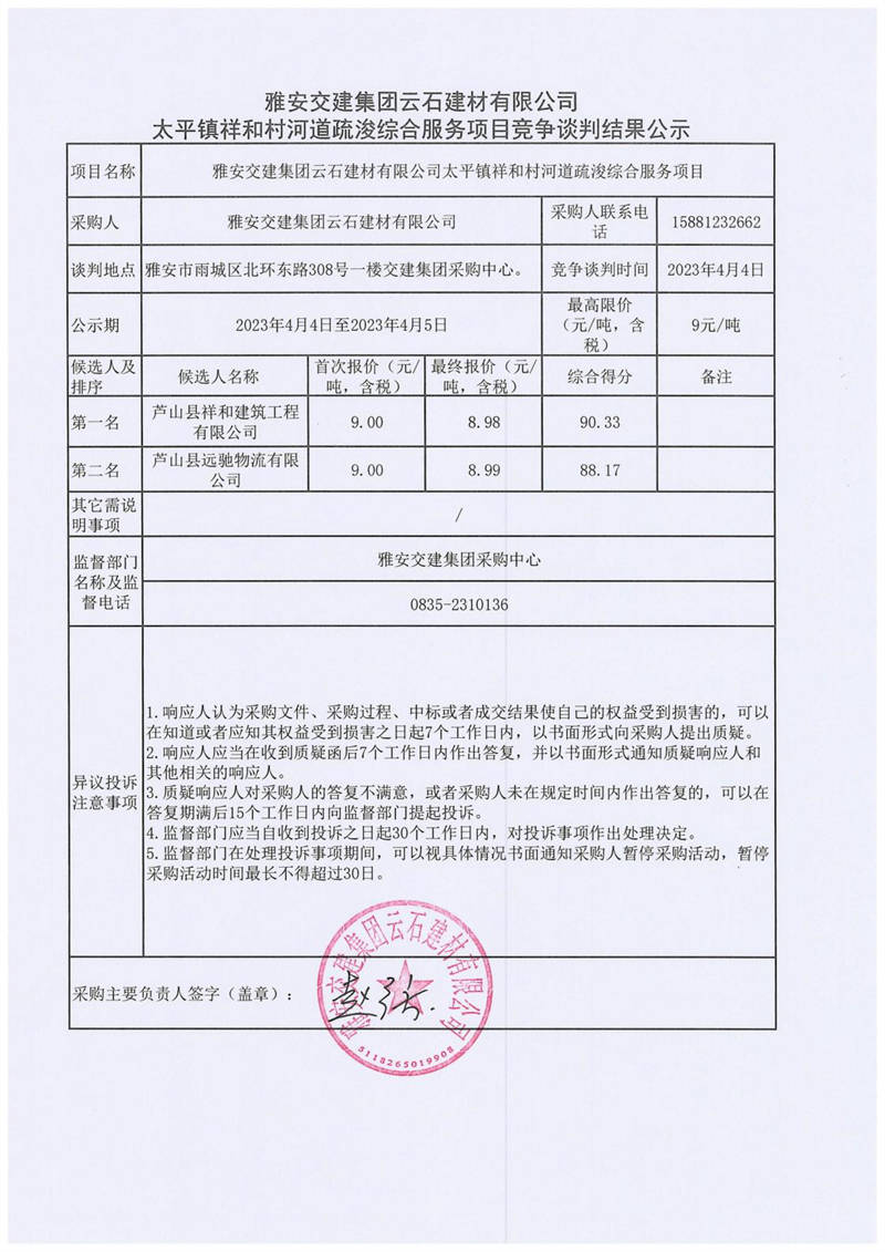 雅安交建集團云石建材有限公司太平鎮(zhèn)祥和村河道疏浚綜合服務項目競爭談判結果公示