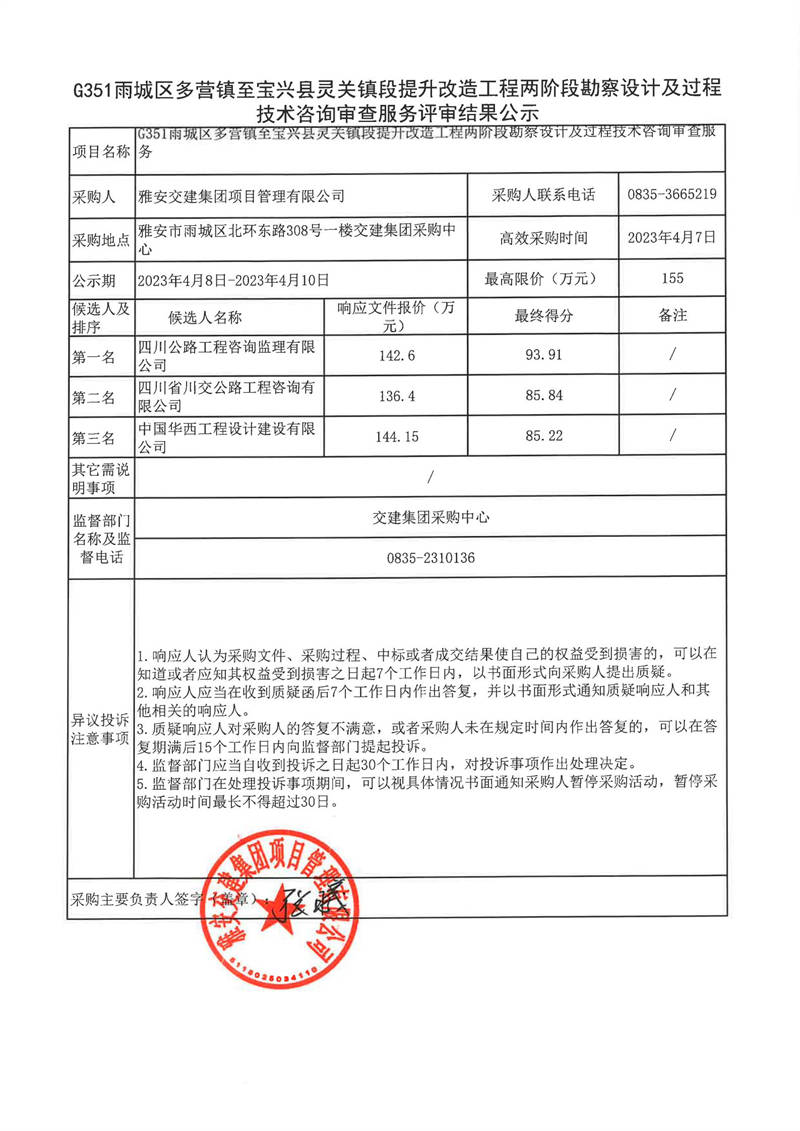 雅安交建集團項目管理有限公司G351雨城區(qū)多營鎮(zhèn)至寶興縣靈關鎮(zhèn)段提升改造工程兩階段勘察設計及過程技術咨詢審查服務評審結(jié)果公示