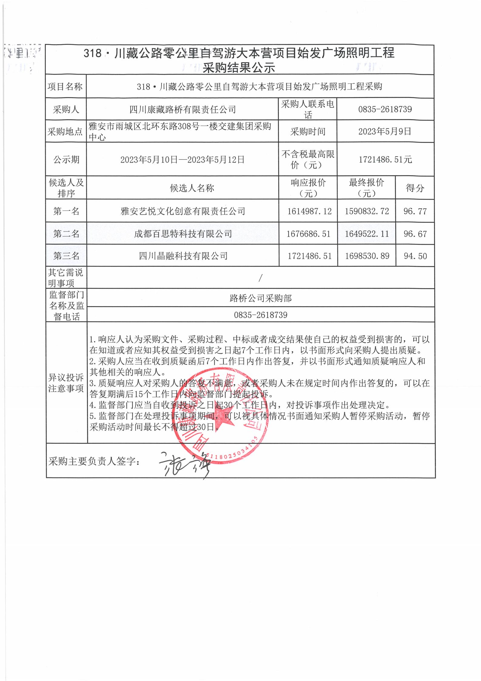 四川康藏路橋有限責任公司318·川藏公路零公里自駕游大本營項目始發(fā)廣場照明工程采購結(jié)果公示