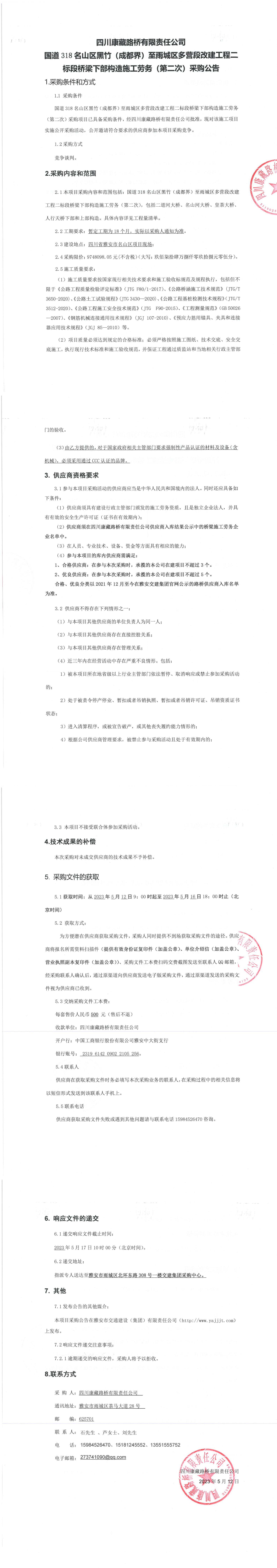 四川康藏路橋有限責任公司國道318名山區(qū)黑竹(成都界)至雨城區(qū)多營段改建工程二標段橋梁下部構造施工勞務(第二次)采購公告