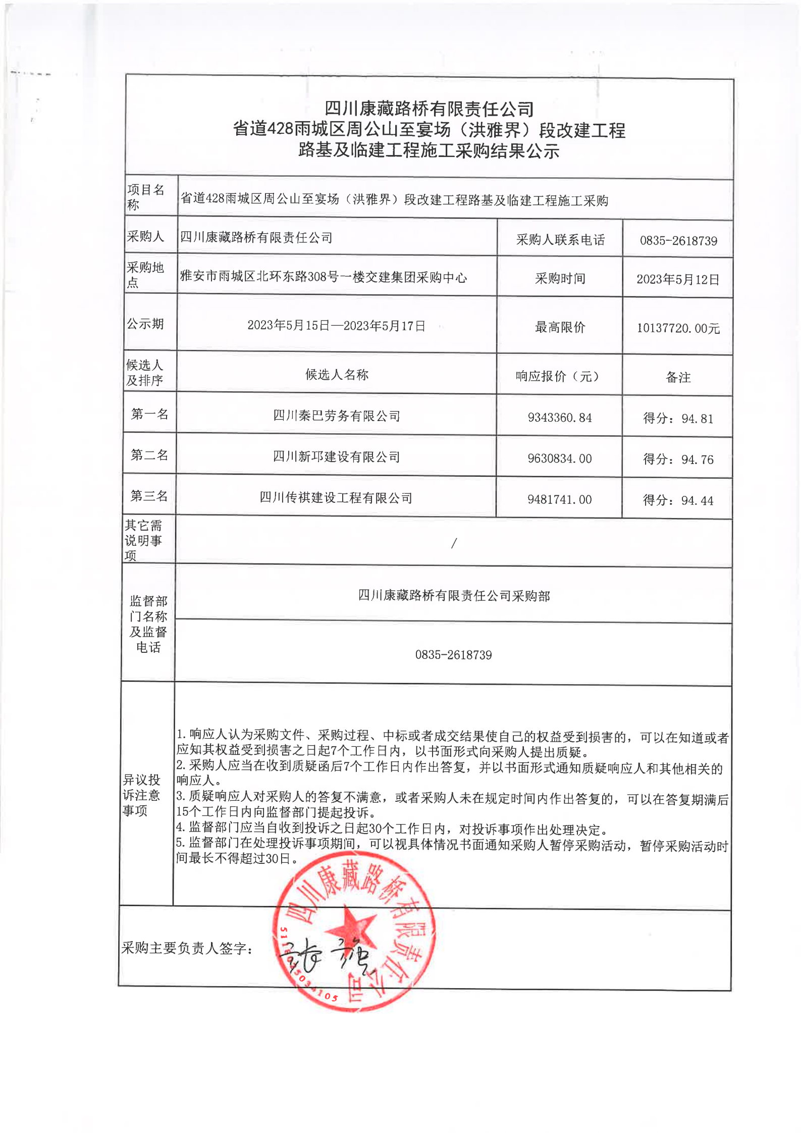 四川康藏路橋有限責任公司省道428雨城區(qū)周公山至宴場(洪雅界)段改建工程路基及臨建工程施工采購結果公示