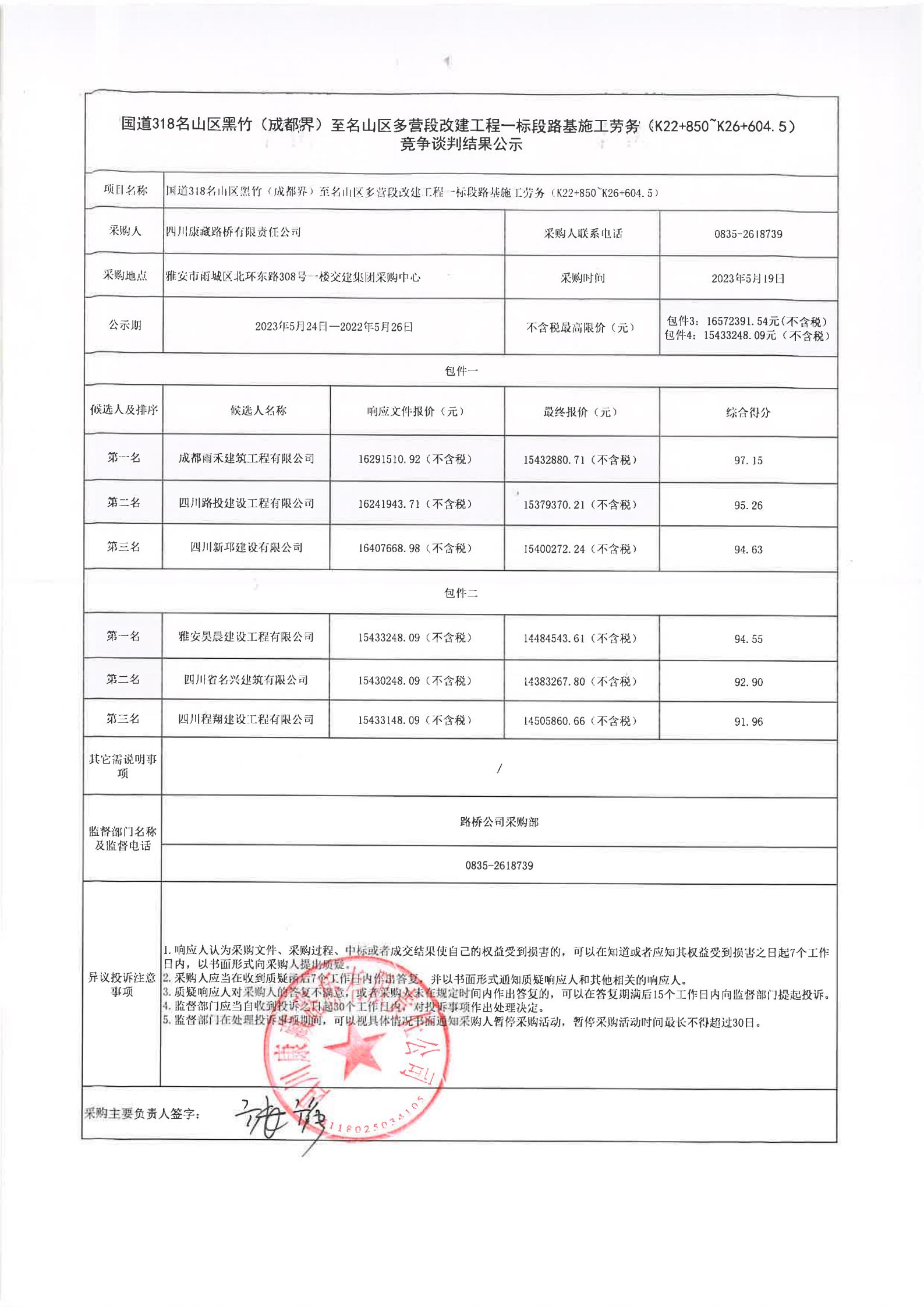 四川康藏路橋有限責(zé)任公司國(guó)道318名山區(qū)黑竹(成都界)至雨城區(qū)多營(yíng)段改建工程一標(biāo)段路基施工勞務(wù)(K22+850~K26+604.5)競(jìng)爭(zhēng)談判結(jié)果公示