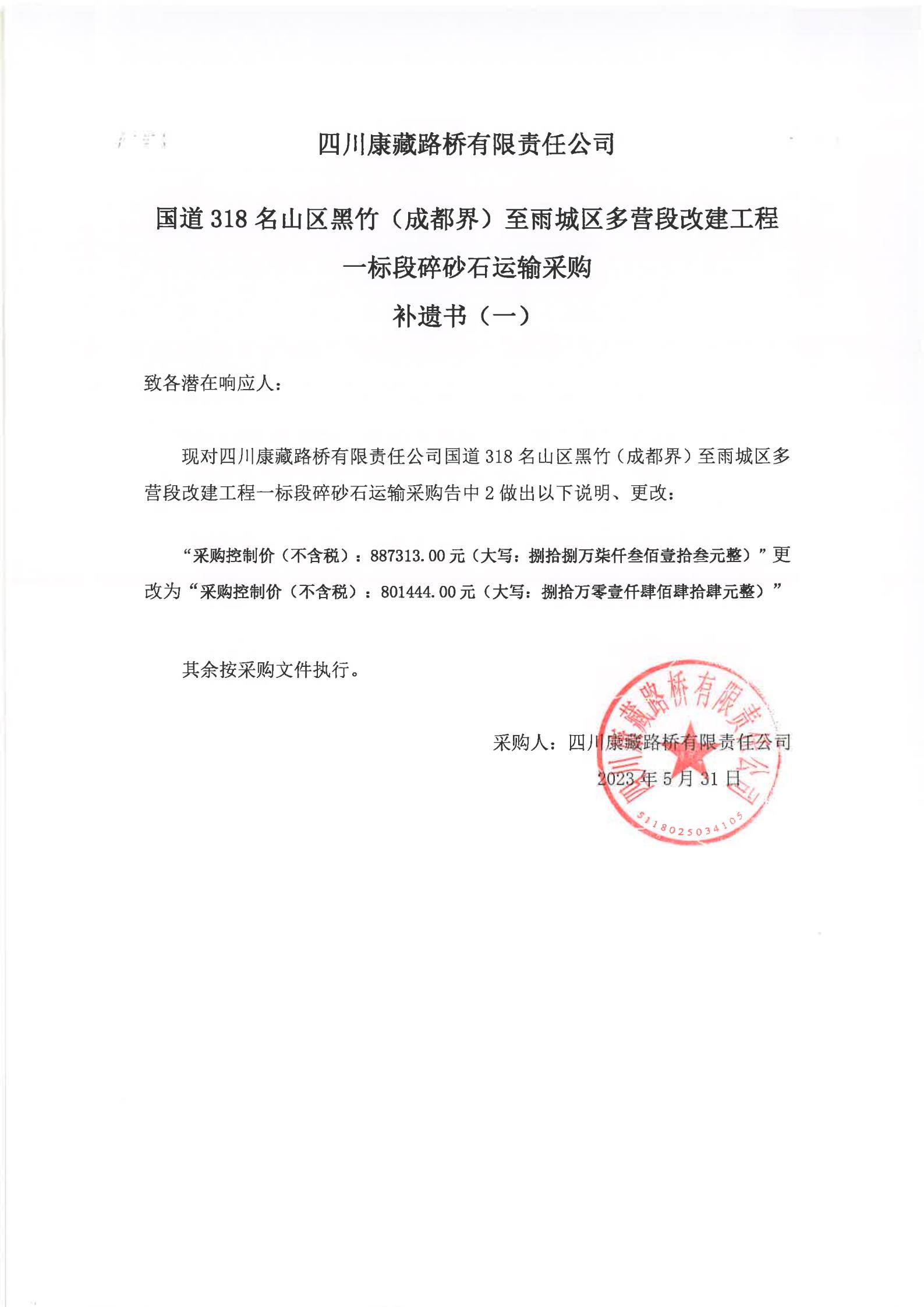 四川康藏路橋有限責(zé)任公司國(guó)道318名山區(qū)黑竹(成都界)至雨城區(qū)多營(yíng)段改建工程一標(biāo)段碎砂石運(yùn)輸采購(gòu)補(bǔ)遺書(一)
