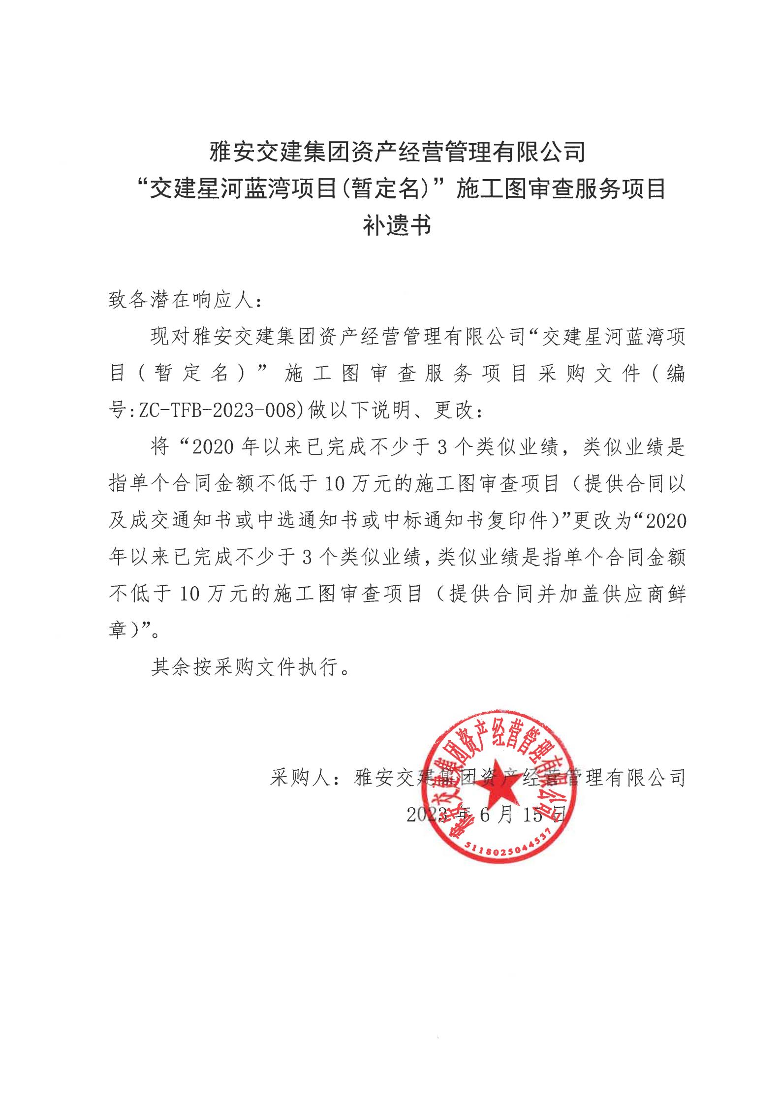 雅安交建集團(tuán)資產(chǎn)經(jīng)營(yíng)管理有限公司“交建星河藍(lán)灣項(xiàng)目(暫定名)”施工圖審查服務(wù)項(xiàng)目采購(gòu)補(bǔ)遺書(shū)