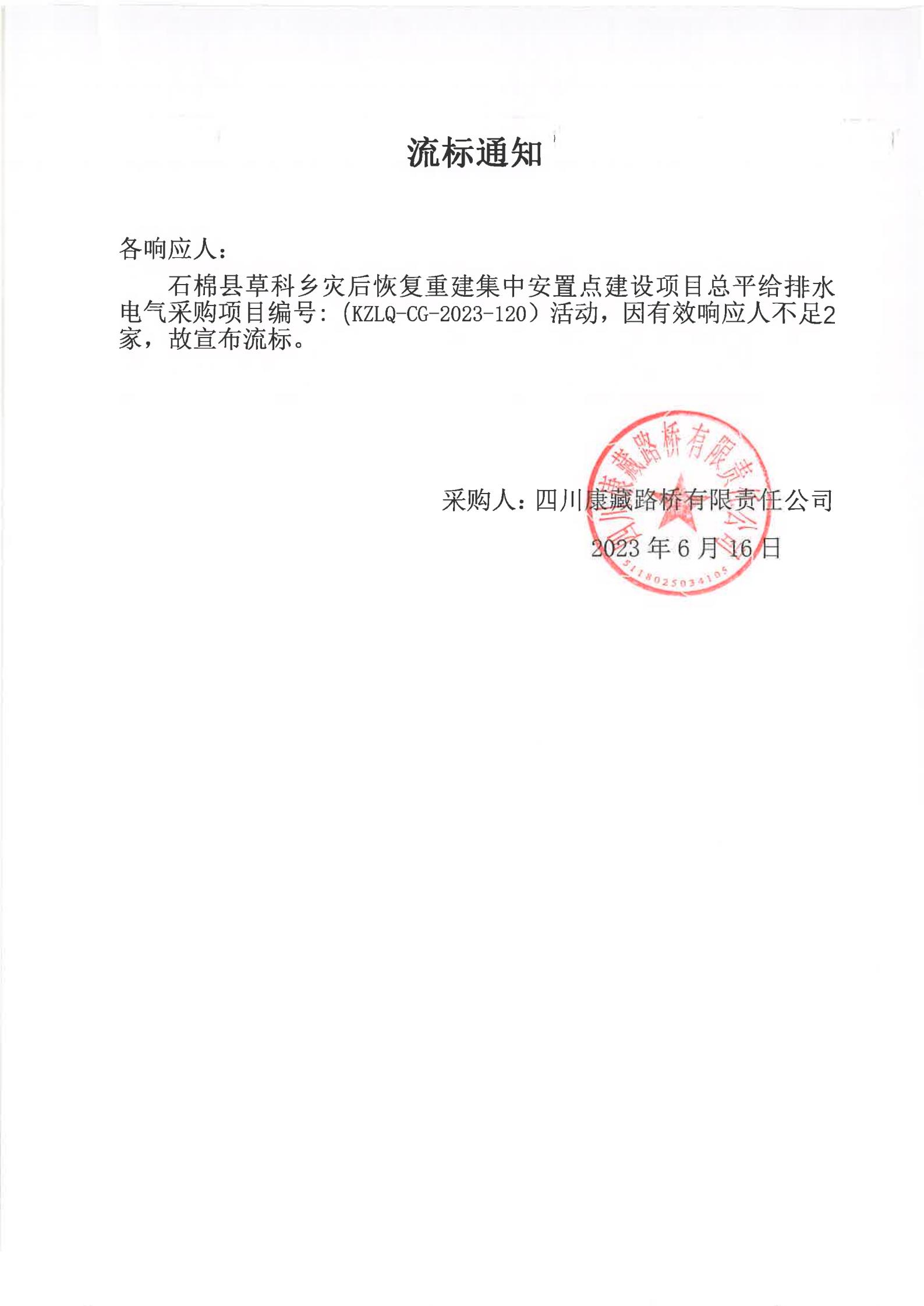 四川康藏路橋有限責任公司石棉縣草科鄉(xiāng)災后恢復重建集中安置點建設項目總平給排水電氣采購流標通知