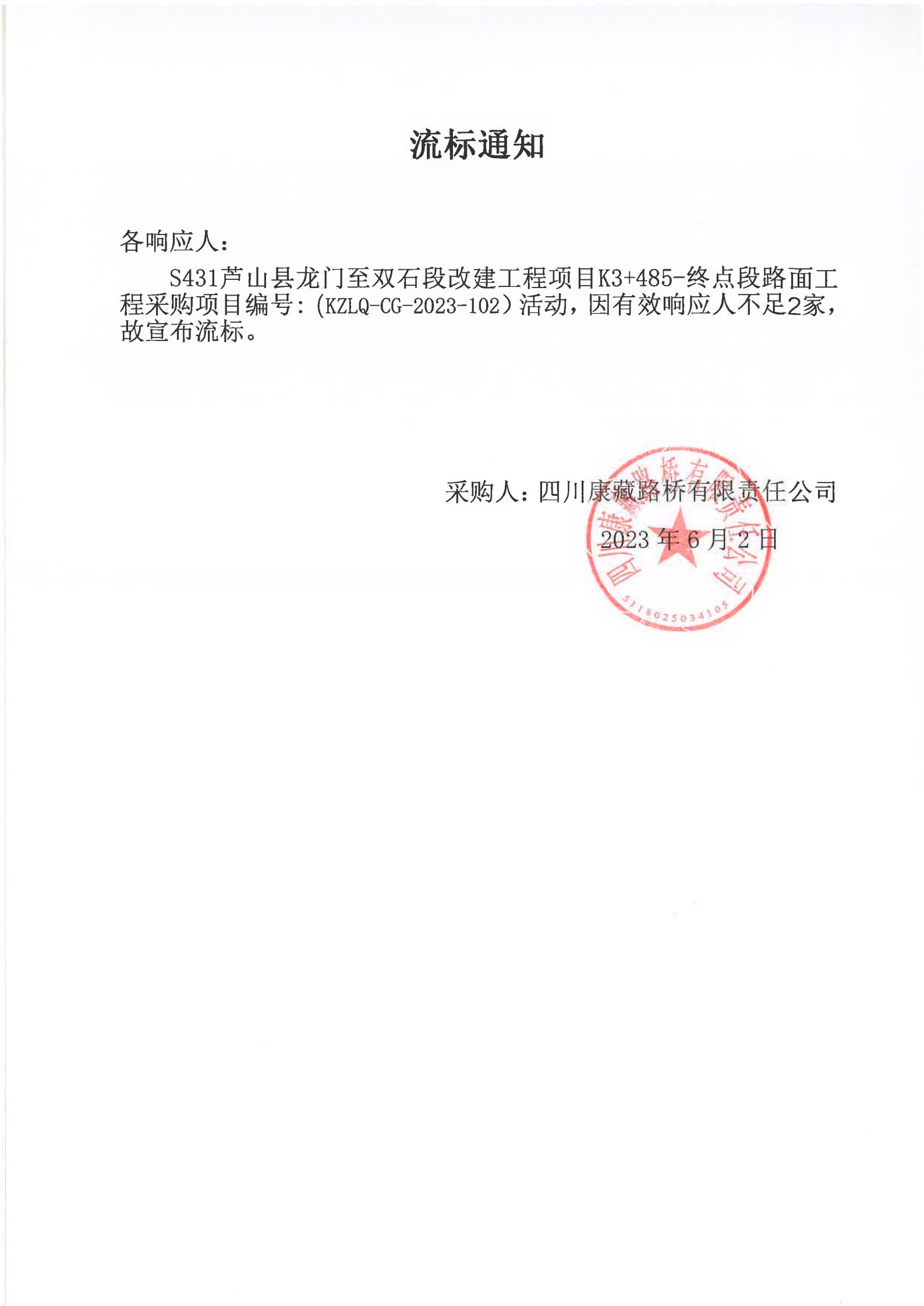 四川康藏路橋有限責任公司S431蘆山縣龍門至雙石段改建工程項目K3+485-終點段路面工程采購項目流標通知