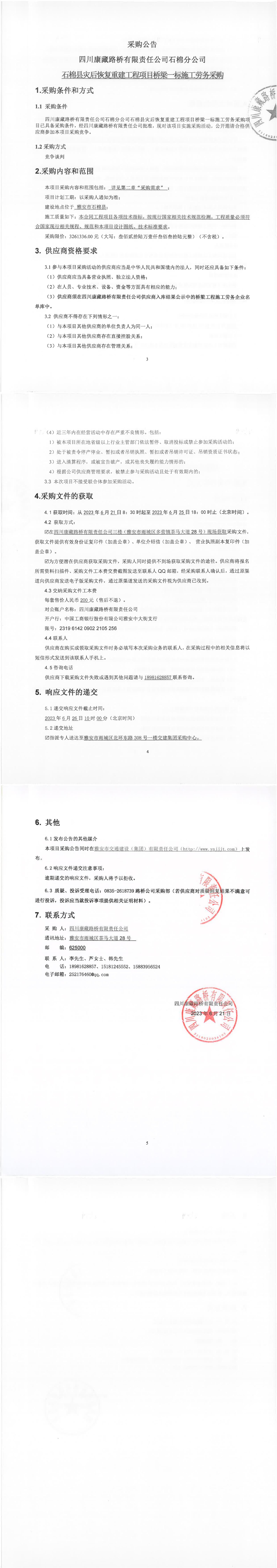 四川康藏路橋有限責任公司石棉分公司石棉縣災后恢復重建工程項目橋梁一標段施工勞務采購公告