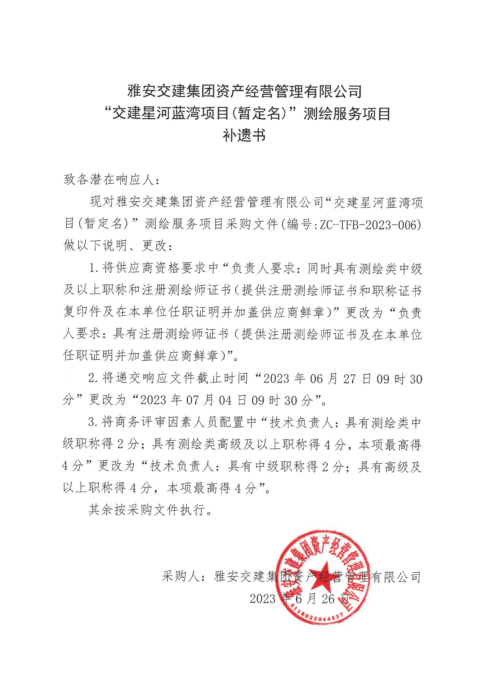 雅安交建集團(tuán)資產(chǎn)經(jīng)營管理有限公司“交建星河藍(lán)灣項目(暫定名)”測繪服務(wù)項目補遺書
