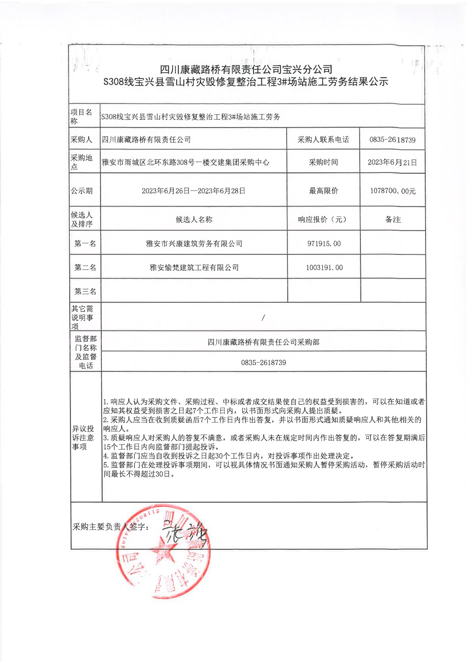 四川康藏路橋有限責(zé)任公司寶興分公司S308線寶興縣雪山村段災(zāi)毀修復(fù)整治工程3#場(chǎng)站施工勞務(wù)結(jié)果公示