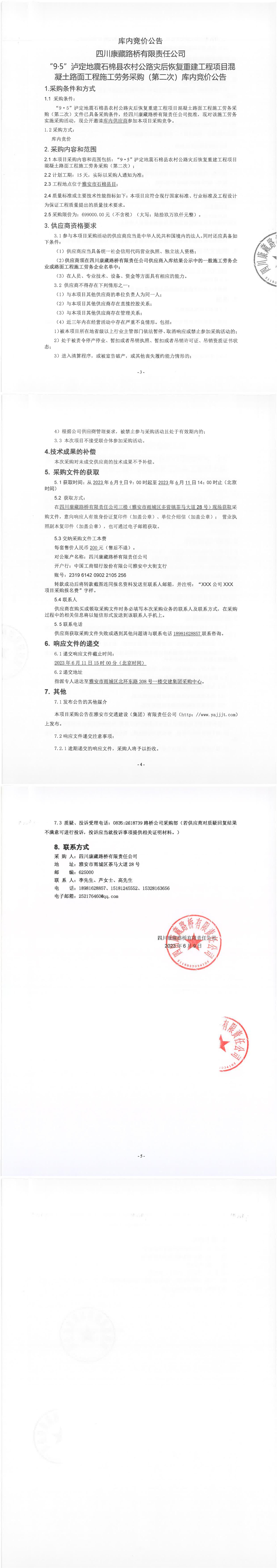四川康藏路橋有限責任公司“9·5”瀘定地震石棉縣農(nóng)村公路災后恢復重建工程項目混凝土路面工程施工勞務采購(第二次)庫內(nèi)競價公告