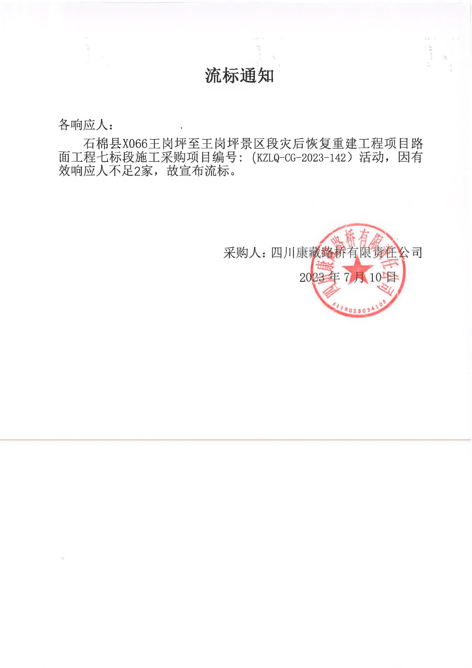 四川康藏路橋有限責(zé)任公司石棉縣X066王崗坪至王崗坪景區(qū)段災(zāi)后恢復(fù)重建工程項(xiàng)目路面工程七標(biāo)段施工采購流標(biāo)通知