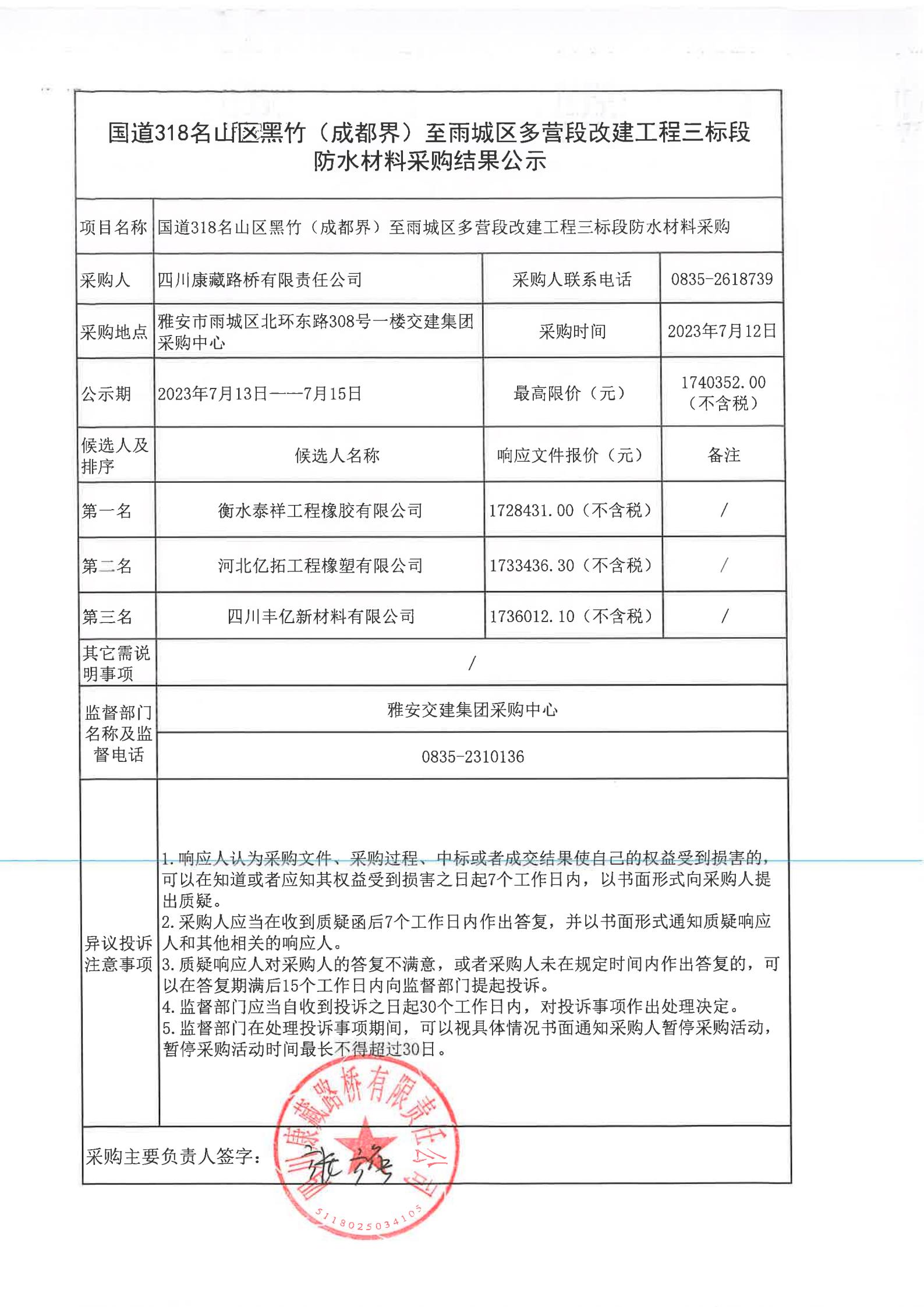 四川康藏路橋有限責(zé)任公司國(guó)道318名山區(qū)黑竹(成都界)至雨城區(qū)多營(yíng)段改建工程三標(biāo)段防水材料采購結(jié)果公示