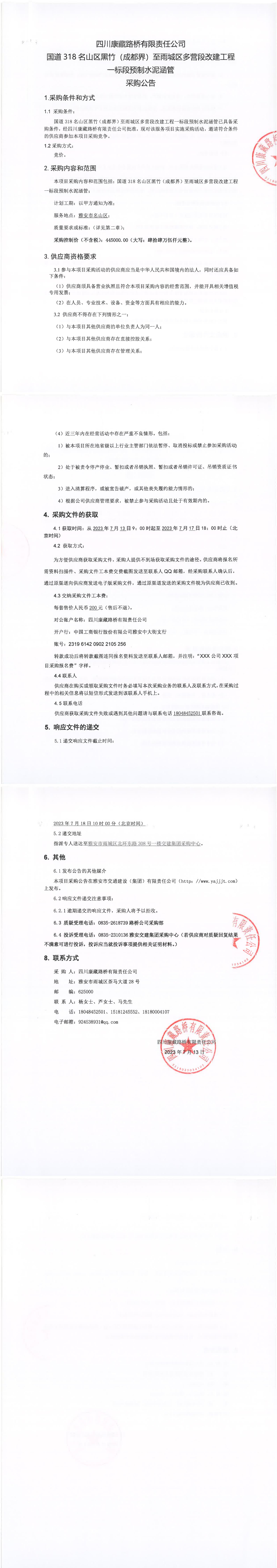 四川康藏路橋有限責(zé)任公司國(guó)道318名山區(qū)黑竹(成都界)至雨城區(qū)多營(yíng)段改建工程一標(biāo)段預(yù)制水泥涵管采購(gòu)公告