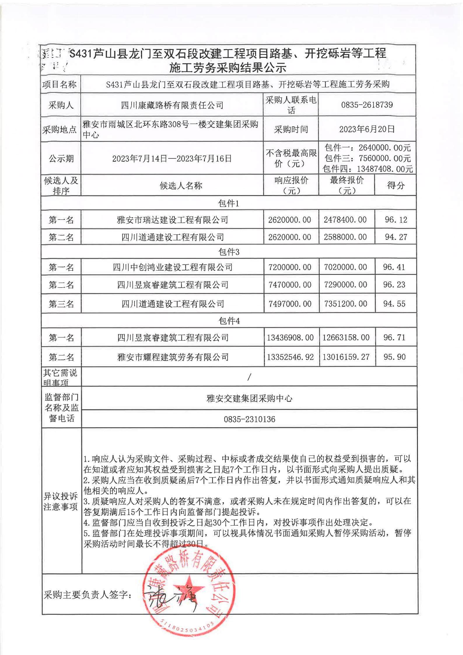 四川康藏路橋有限責任公司S431蘆山縣龍門至雙石段改建工程項目路基、開挖礫巖等工程施工勞務采購結(jié)果公示